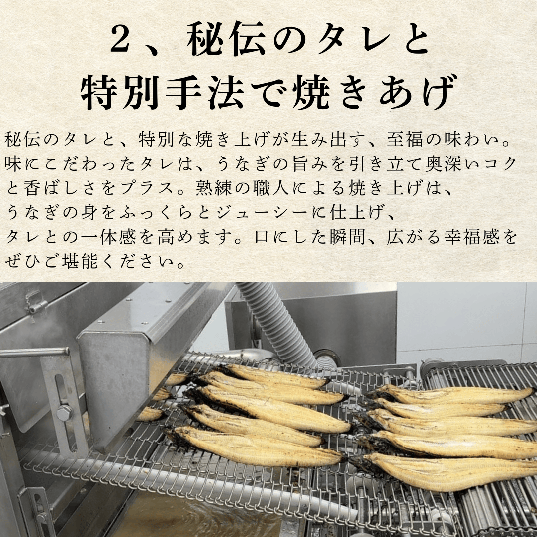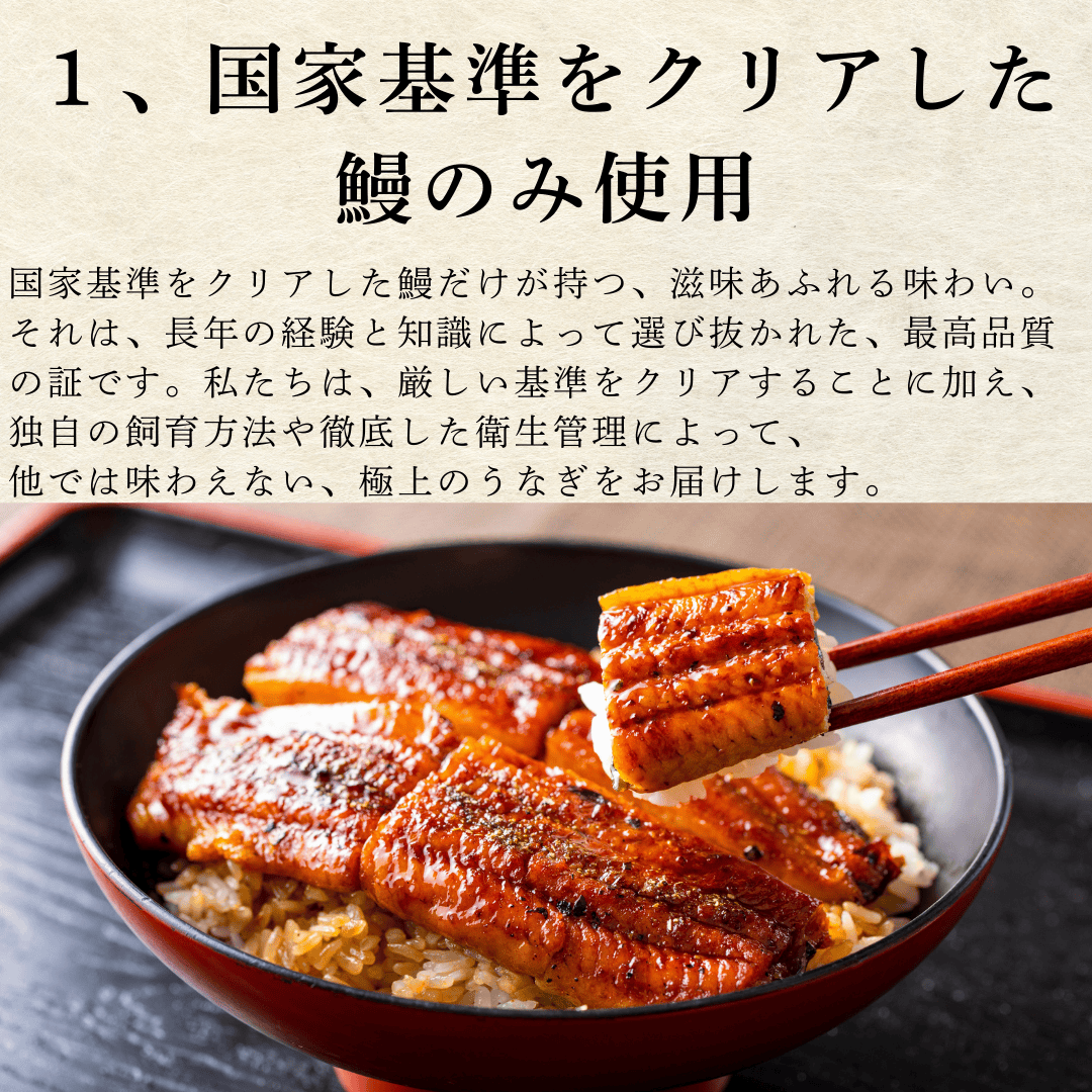 | 原材料名 | うなぎ(中国産・養殖)、タレ(しょうゆ(小麦・大豆を含む)、ぶどう糖果糖液糖、発酵調味料、砂糖、食塩/酒精、増粘剤(加工澱粉、増粘多糖類)、着色料(紅麹、カラメル、クチナシ)調味料(アミノ酸等) |
